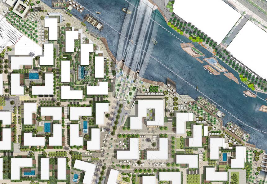 A community of residential clusters along Dubai’s busy waterways. Each cluster has its own communal amenities, all linked by tree-shaded, pedestrian-friendly paths with small retreats. These pathways lead to the waterfront, featuring one of Calatrava’s striking bridge designs.